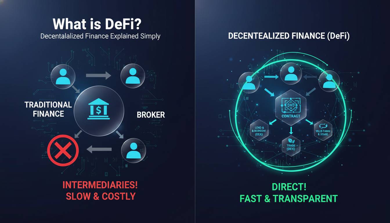 For anyone asking “what is DeFi?” in simple terms, think of it as replacing traditional financial middlemen with computer code. When you take out a loan from a bank, the bank acts as an intermediary, holding your money, verifying your identity, and processing the transaction. In DeFi, a smart contract handles all of these functions automatically, connecting borrowers directly to lenders through cryptocurrency platforms.